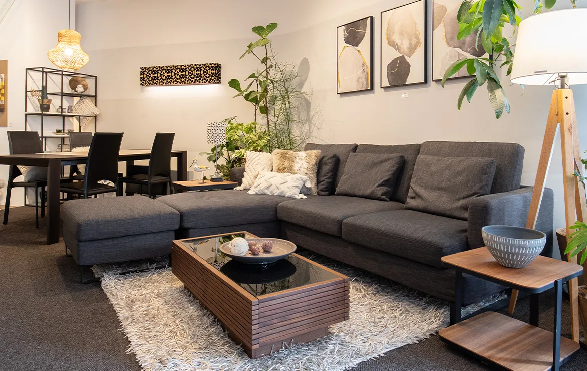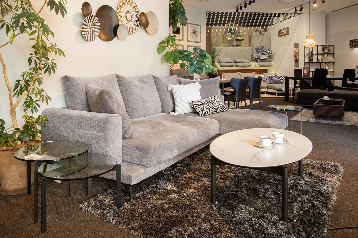 グレーのカウチソファーはゆとりのロースタイルでお部屋の中心に配置しても視界を遮らず、