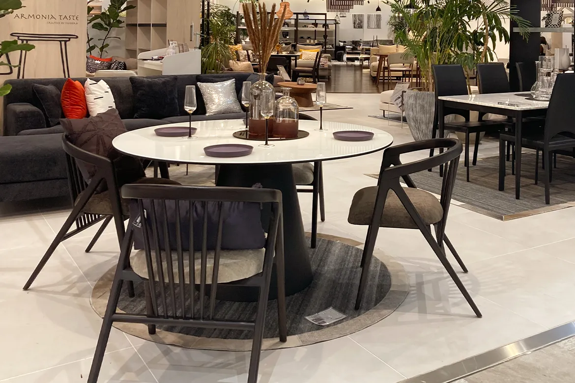 天然木の美しいラウンドダイニングテーブルは、オブジェのような造形美でモダンスタイルを創造します。