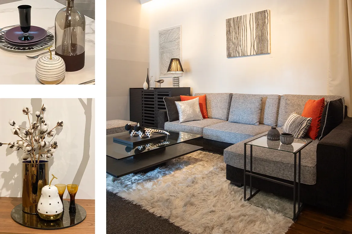 モダンな空間を演出し、アクセントに小物を置くことで個性を感じさせます。 -