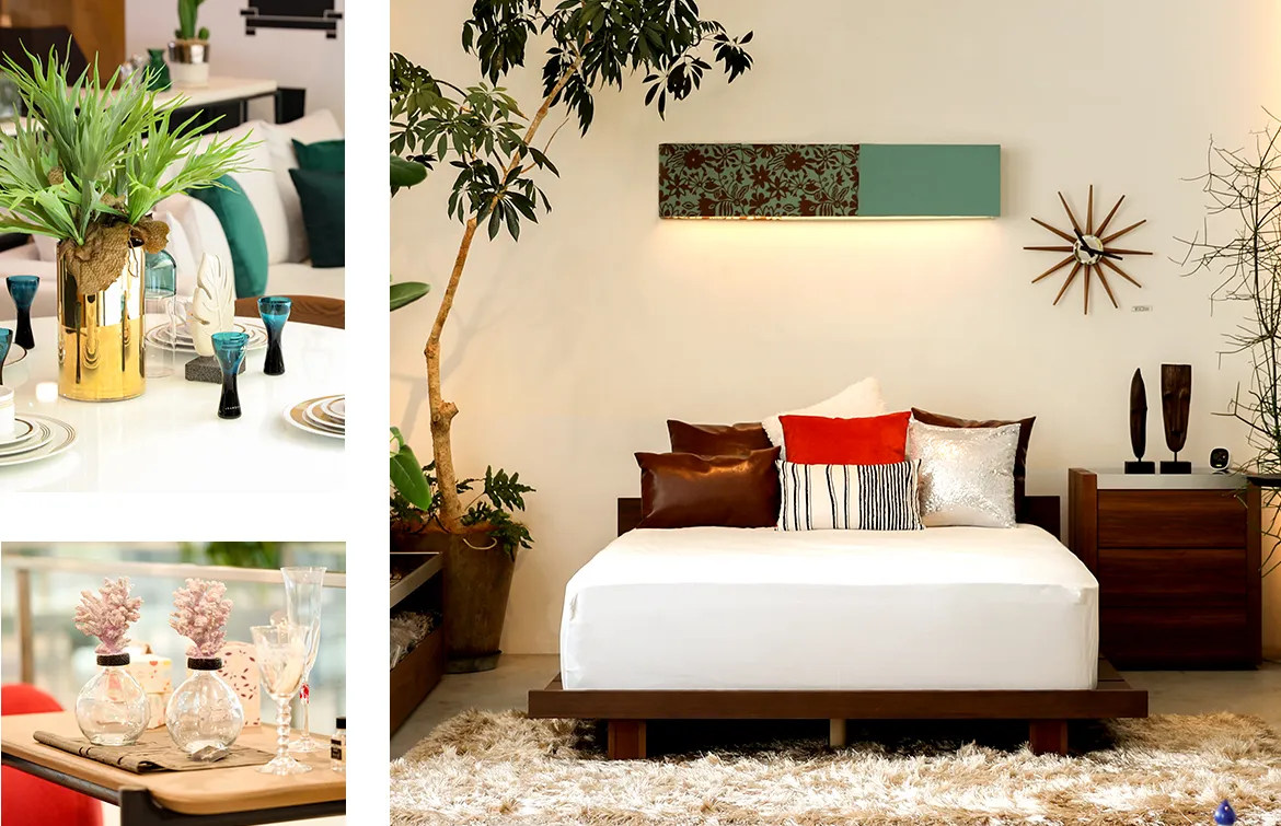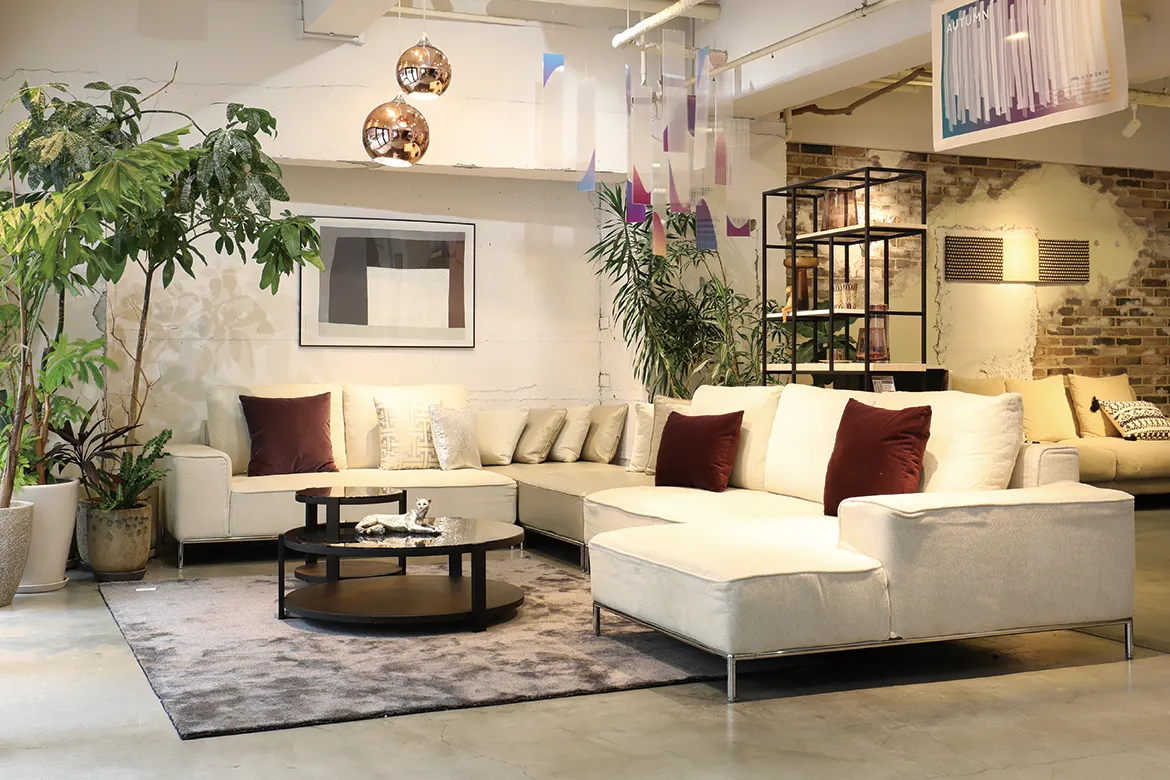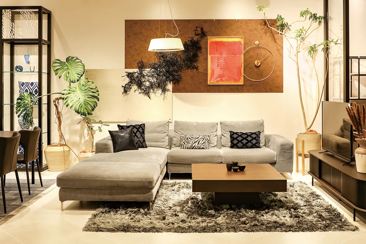 ラグジュアリーモダンな空間を演出します。木製のラウンドローテーブルや植物を配置することにより、