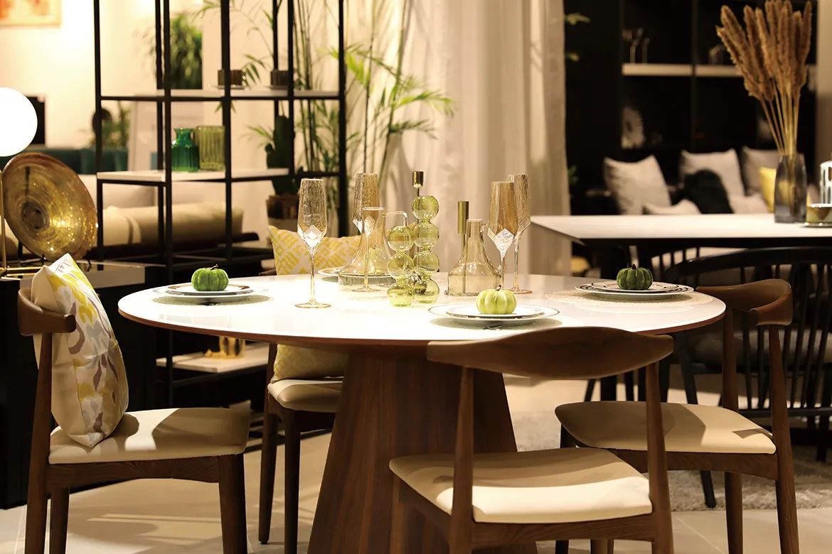 オブジェのような造形美のラウンドダイニングテーブル。