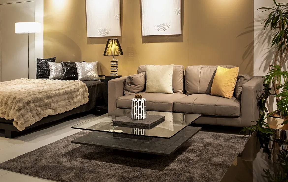 センターテーブルは木目が美しいウッドフレームとスタイリッシュなブラックガラスが絶妙なバランスで調和。