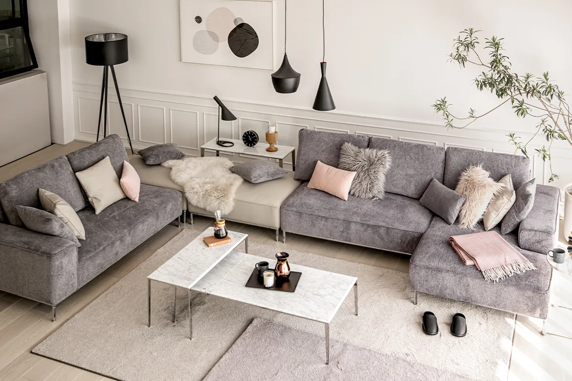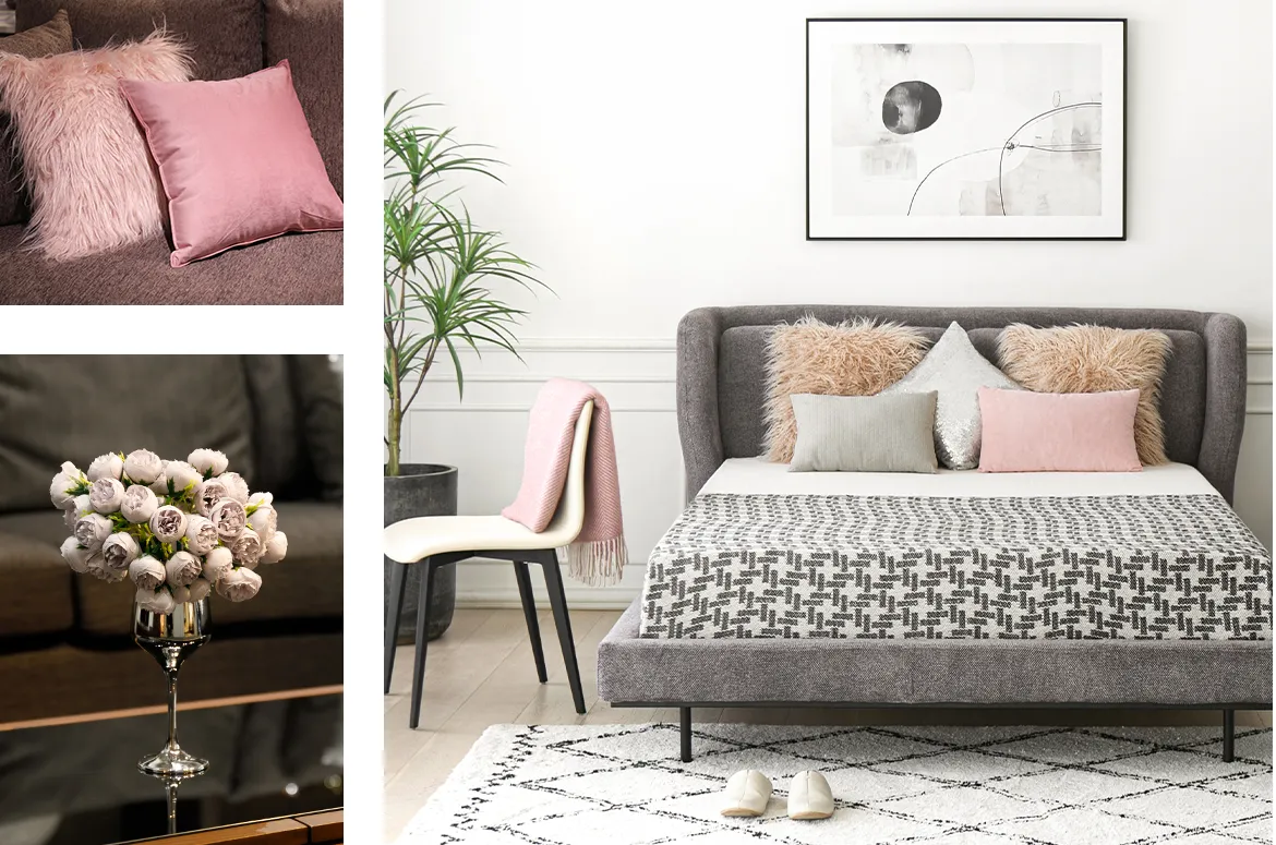 ホワイトトーンの空間に、グレー、スイートピンク、ブラックを取り入れたインテリアが落ち着きを感じられる空間。