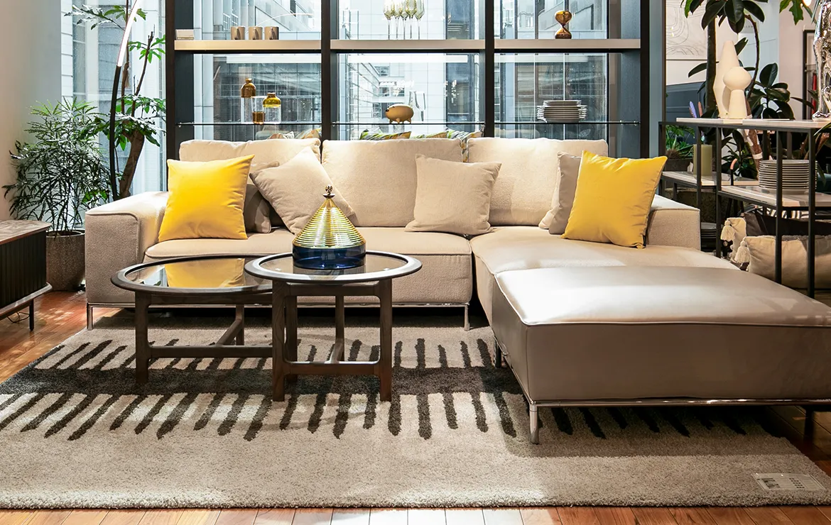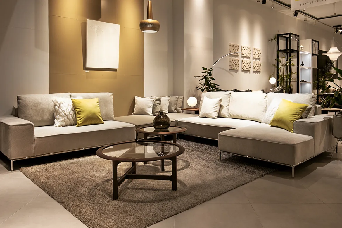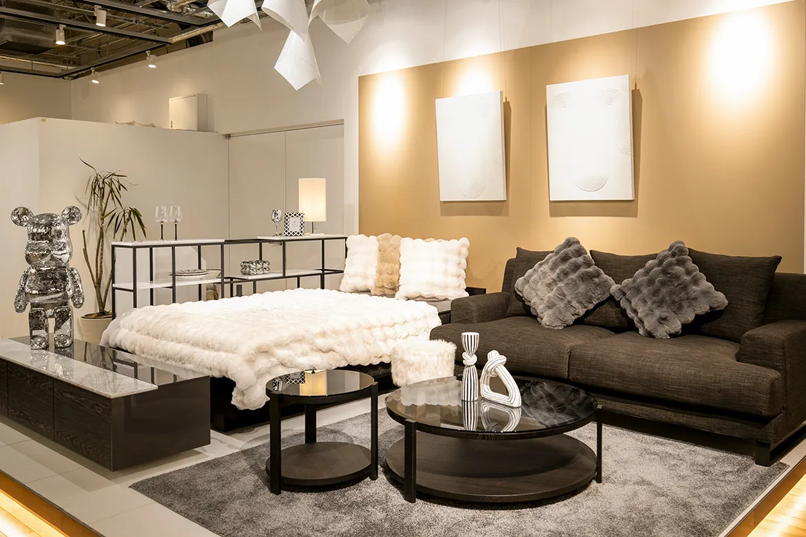 春の息吹を感じさせる、柔らかなトーンで合わせたベージュカラーのソファセットを使用したコーディネート。