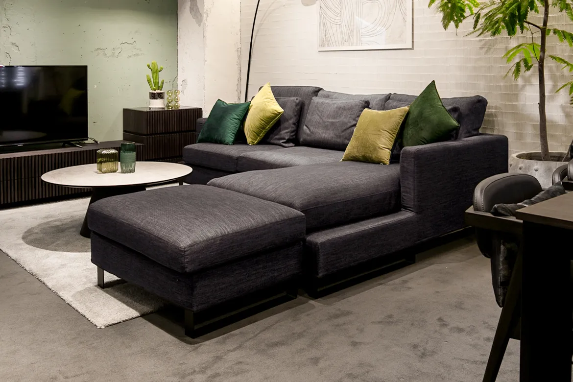 空間を引き締めるダークグレーのカウチソファに深みのあるフォレストグリーンのクッションが