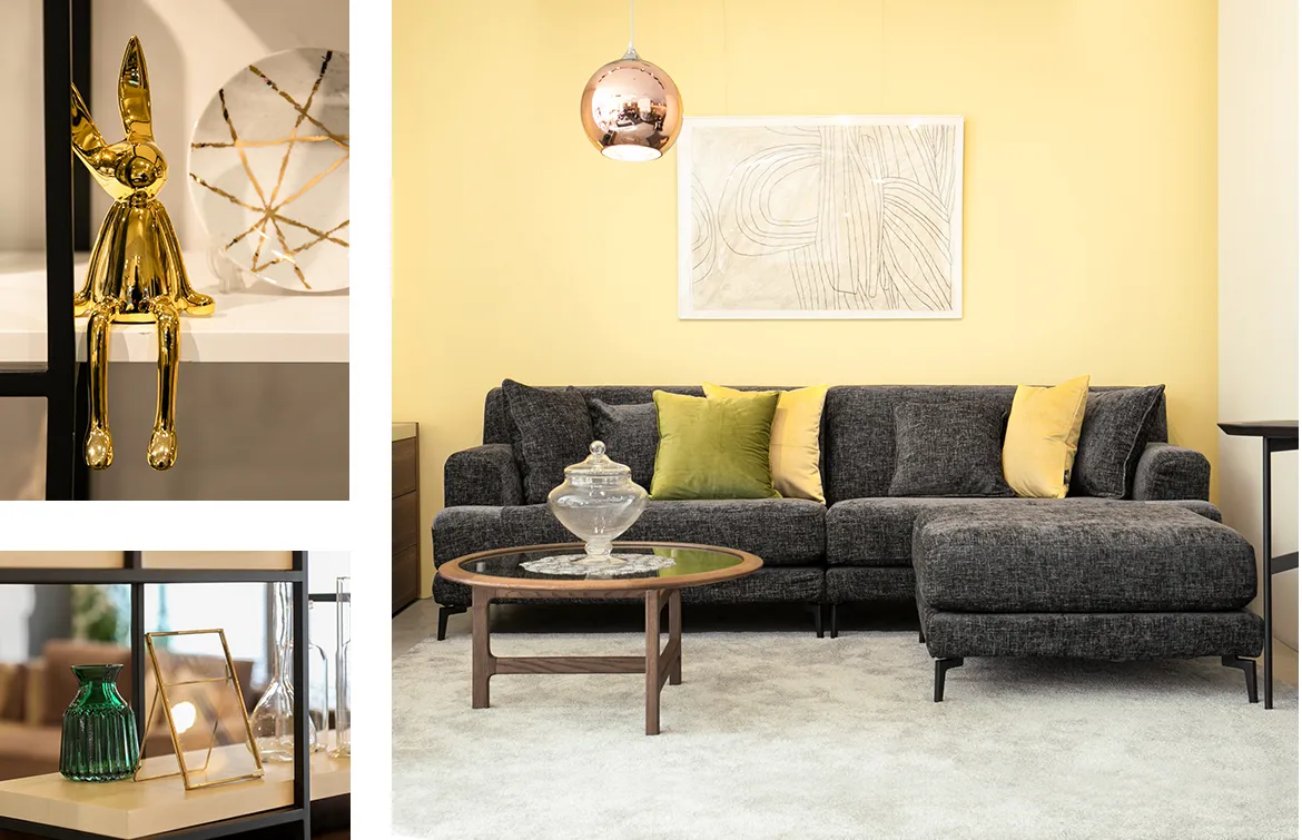 バターイエローのクッションやテラコッタカラーの小物を置くことで、視覚的なコントラストが生まれ