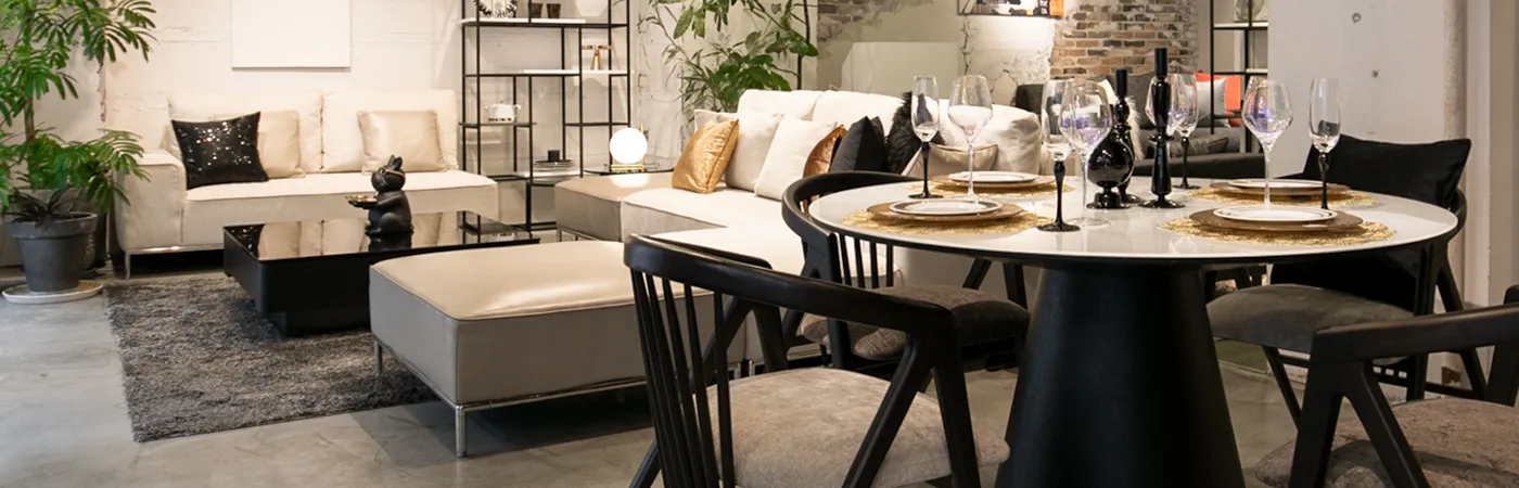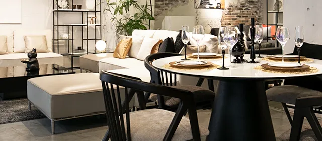 大理石調トップのローテーブルにグリーンの小物を置くことで、ラグジュアリーな色合いと