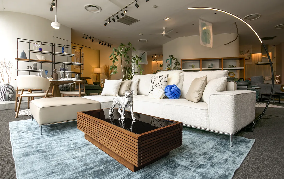 透明感のあるガラス天板と天然木フレームで設計されたローテーブルが、軽やかな印象をプラス。