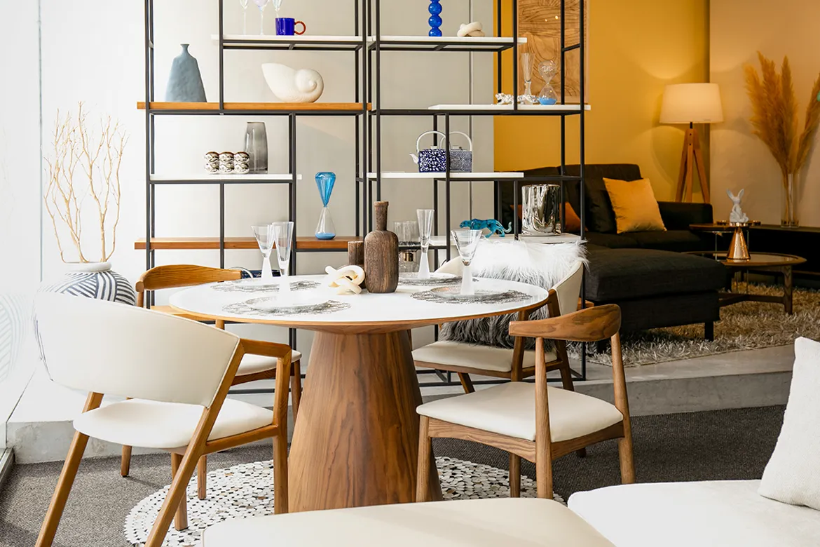 ホワイト天板とブラック脚のコントラストが効いたラウンドテーブルが空間を引き締めます。