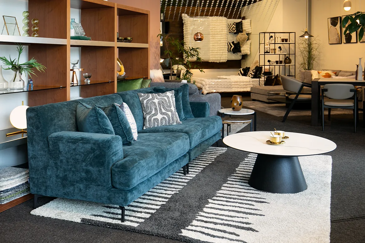 鮮やかなブルーグリーンのストレートソファを主役にしたコーディネート。