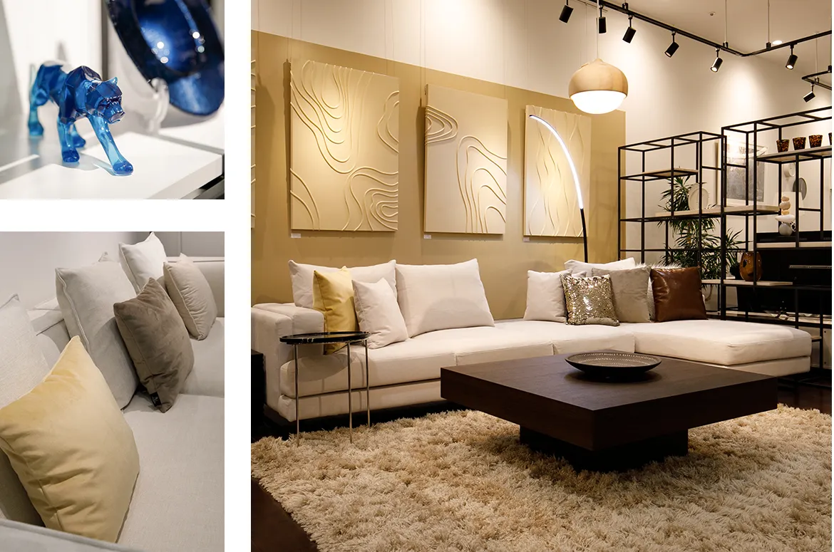 幾何学模様のクッションや有機的フォルムの花瓶をあわせることでアイテムの個性が調和し、