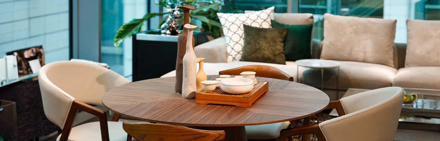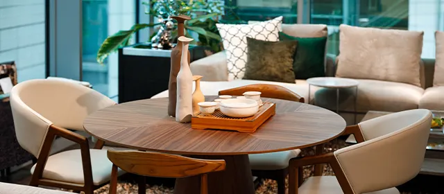 天然木を使用したラウンドテーブルとチェアは、温もりある素材感と丸みのあるフォルムでまとめ、