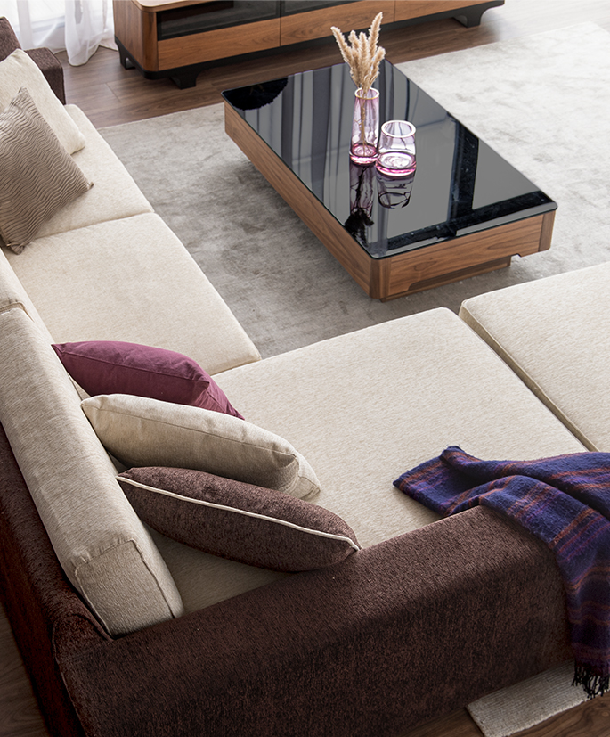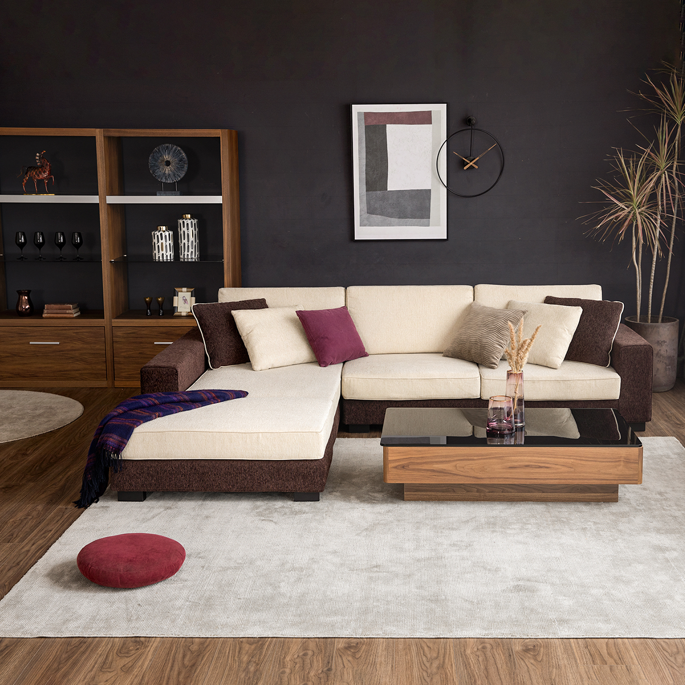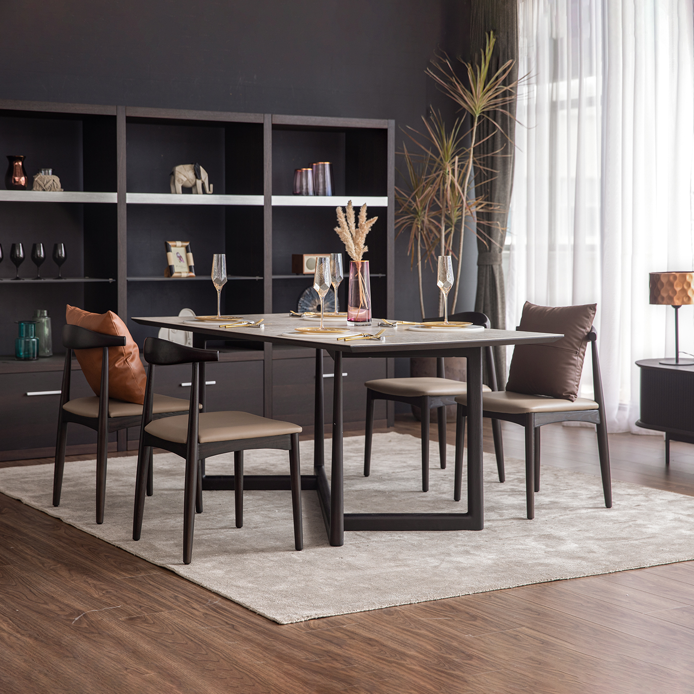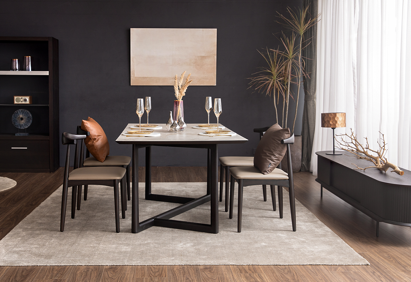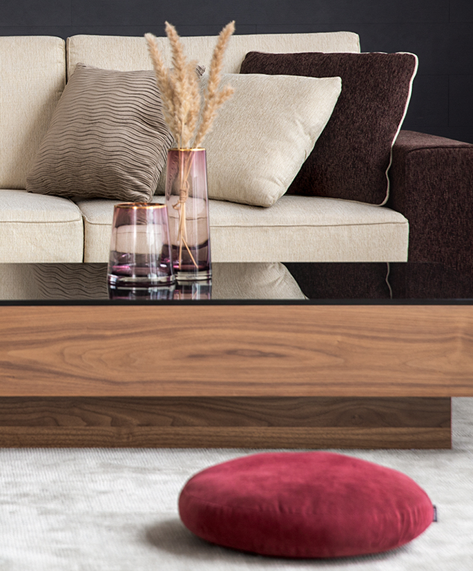 ピンクカラーをインテリアに取り入れやすいのはベリートーン。ダークウッドとの相性が良く、上質な素材を厳選することで空間全体に高級感、さらには抜け感を生み出し、ワンランク上の洗練されたスタイルに引き上げます。スモーキーなペールトーンを合わせることで、エレガントなテイストが加わり、日常の空間に奥行きと深みをもたらします。