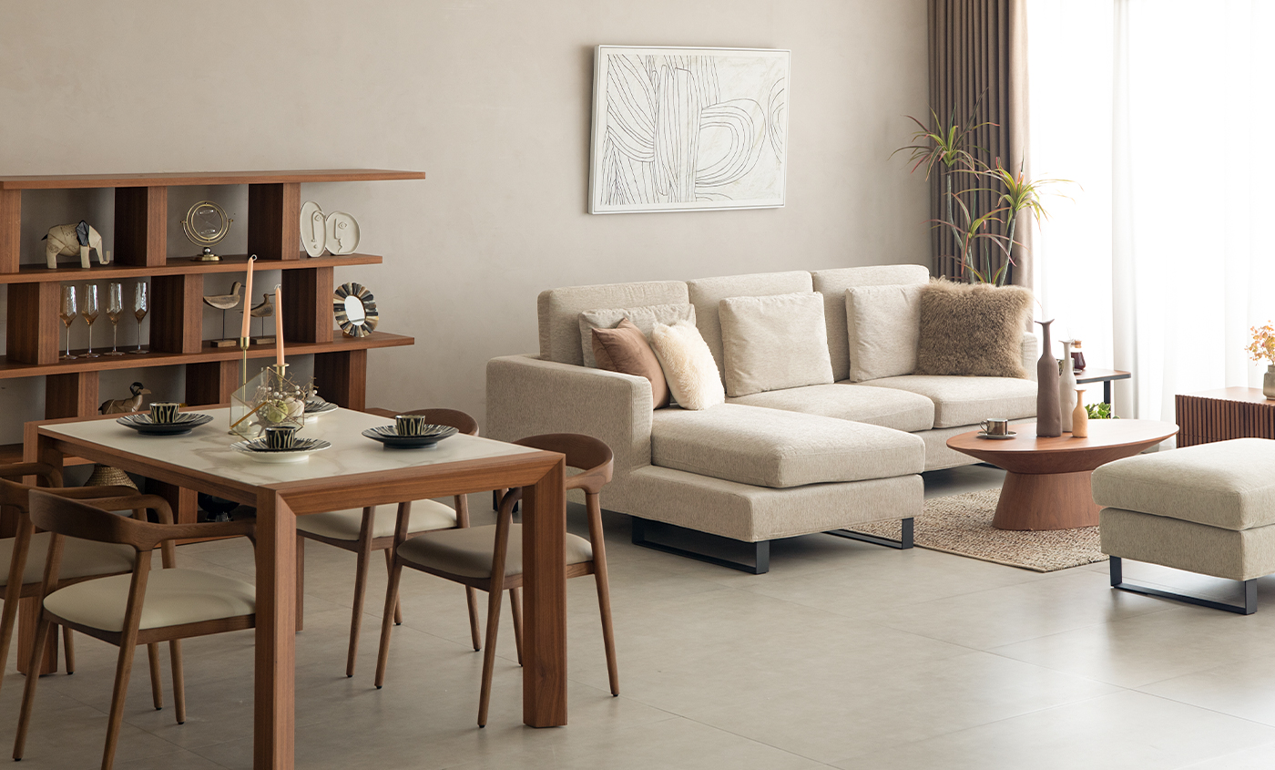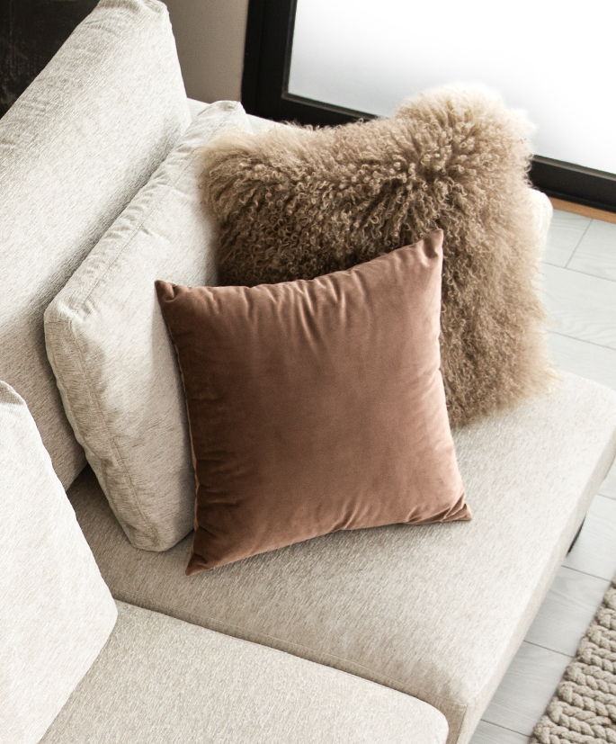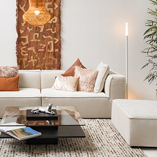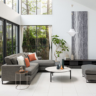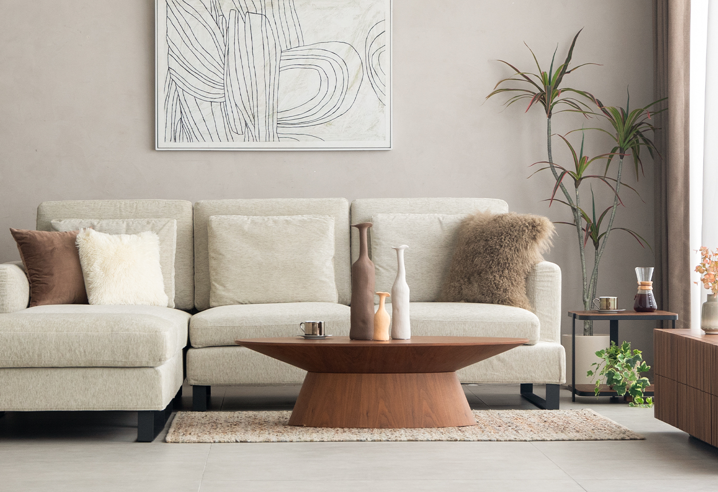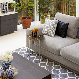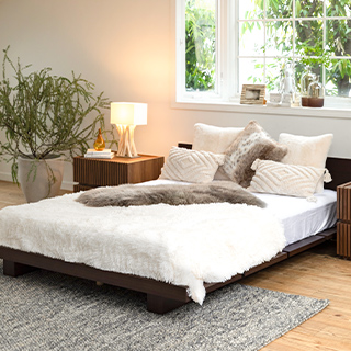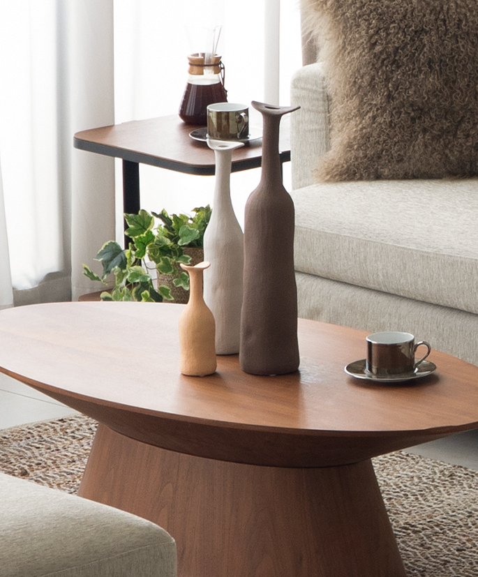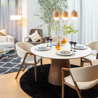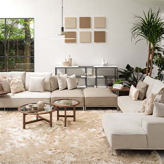 天然木のぬくもりと、柔らかなカラーが調和するゆったりと流れるような落ち着いた空間。ブラウンをベースとしたベージュのグラデーションは、高級感漂う佇まいを演出します。単調になりがちなグラデーションには、オブジェのように佇むボトルやファークッションを加えて。一味違った優しいアクセントが、ぬくもりと素材の美しさに満ちた空間を惹き立てます。