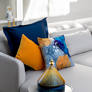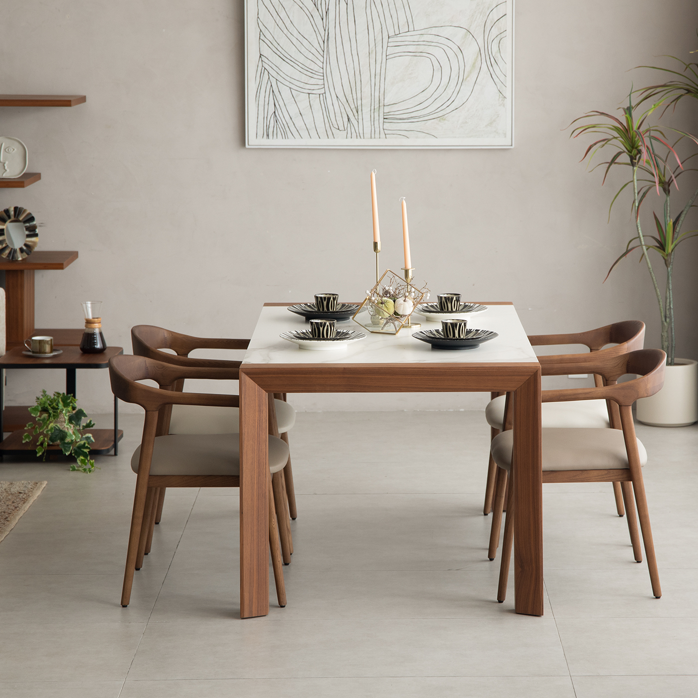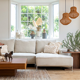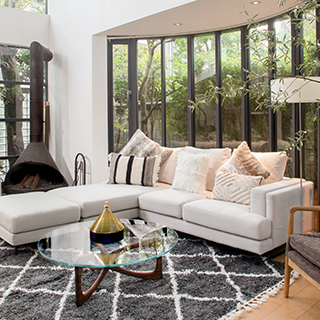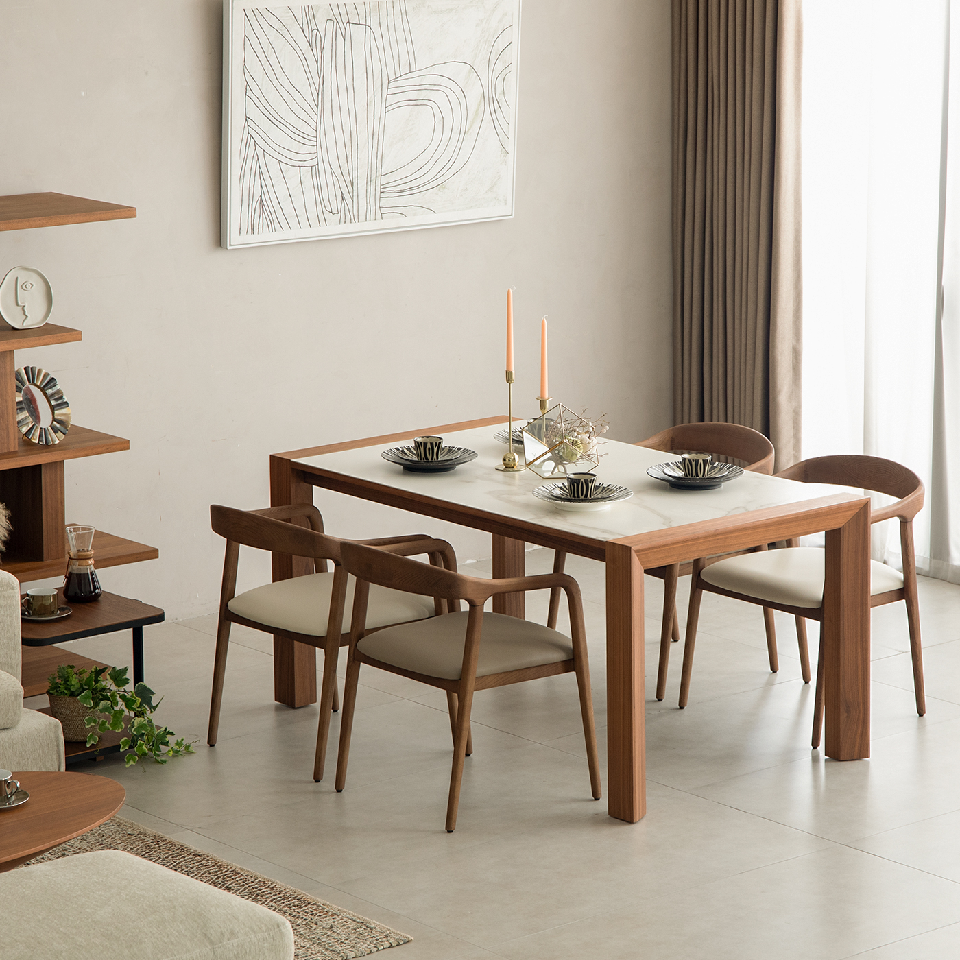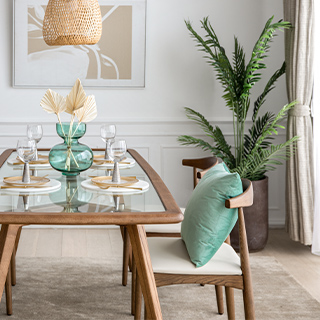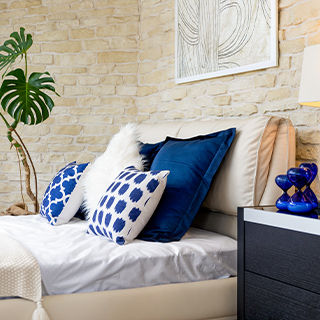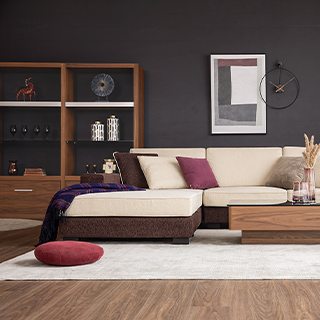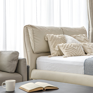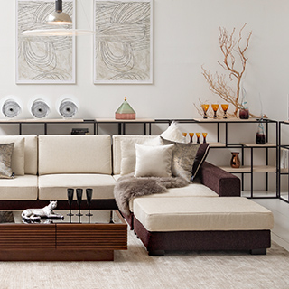 天然木のぬくもりと、柔らかなカラーが調和するゆったりと流れるような落ち着いた空間。ブラウンをベースとしたベージュのグラデーションは、高級感漂う佇まいを演出します。単調になりがちなグラデーションには、オブジェのように佇むボトルやファークッションを加えて。一味違った優しいアクセントが、ぬくもりと素材の美しさに満ちた空間を惹き立てます。