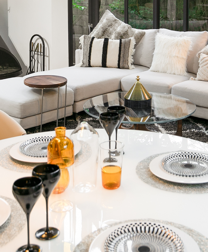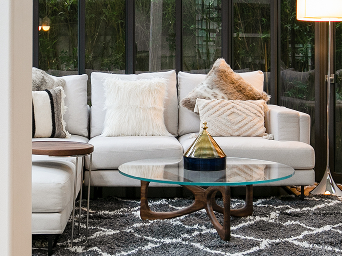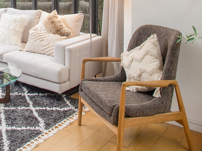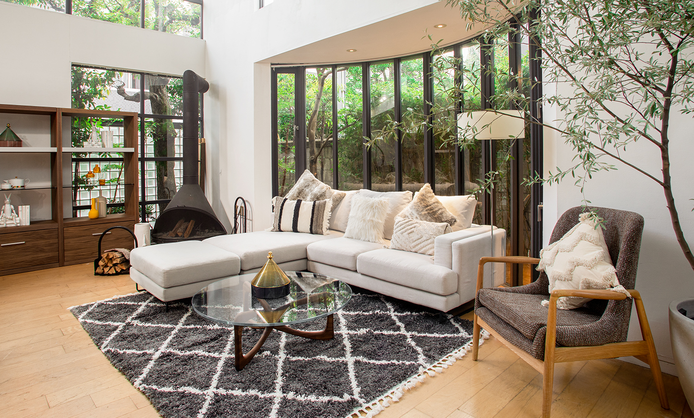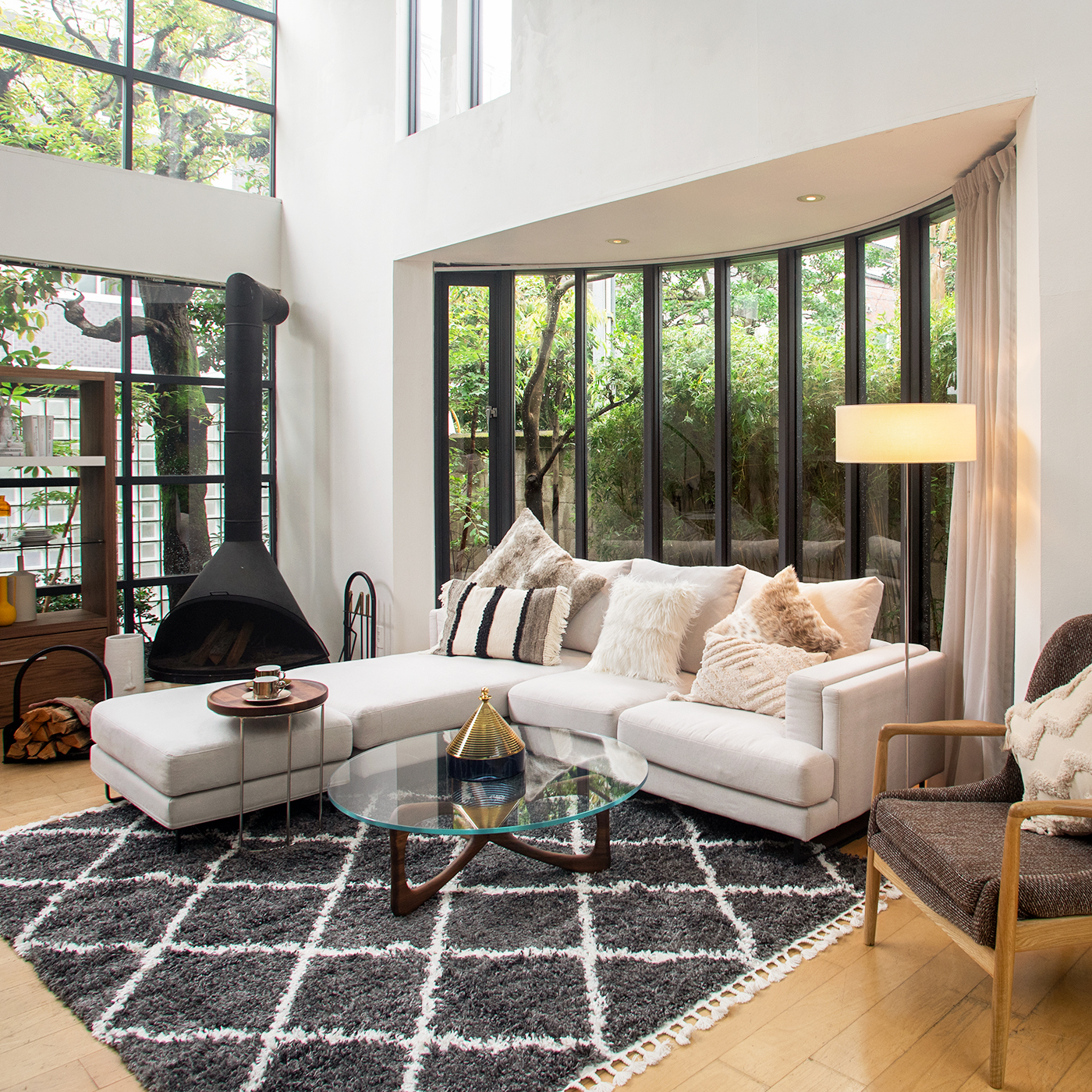 ジオメトリック柄のラグに白いカウチソファを合わせて、視線を引き込むドラマティックな空間が完成。大胆な柄使いが部屋全体の表情を引き立てます。シンプルな白と黒のクッションは、主役のラグと調和し、気品漂う北欧スタイルを演出します。アースカラーを単色またはグラデーションで取り入れることで、北欧のエッセンスを纏った温かみのある雰囲気に。落ち着きの中に温もりを感じる心地よい空間が生まれます。