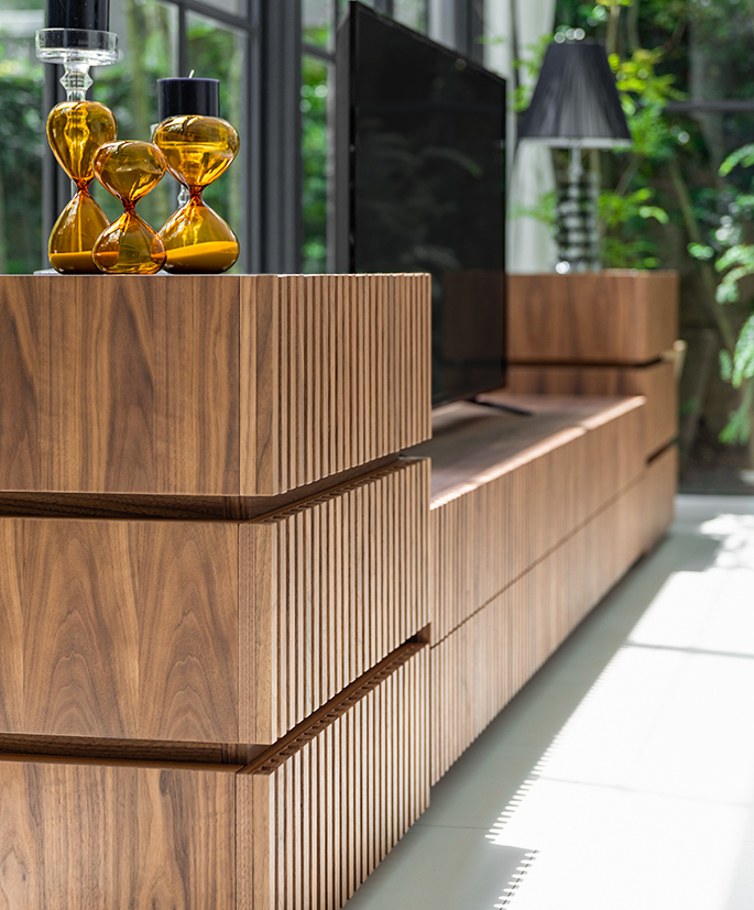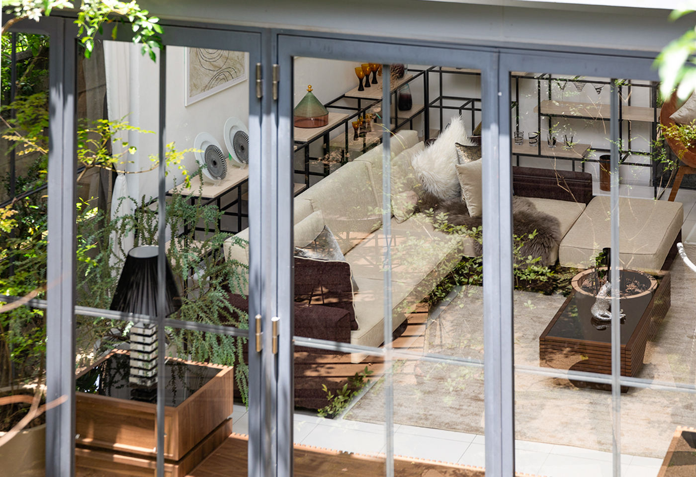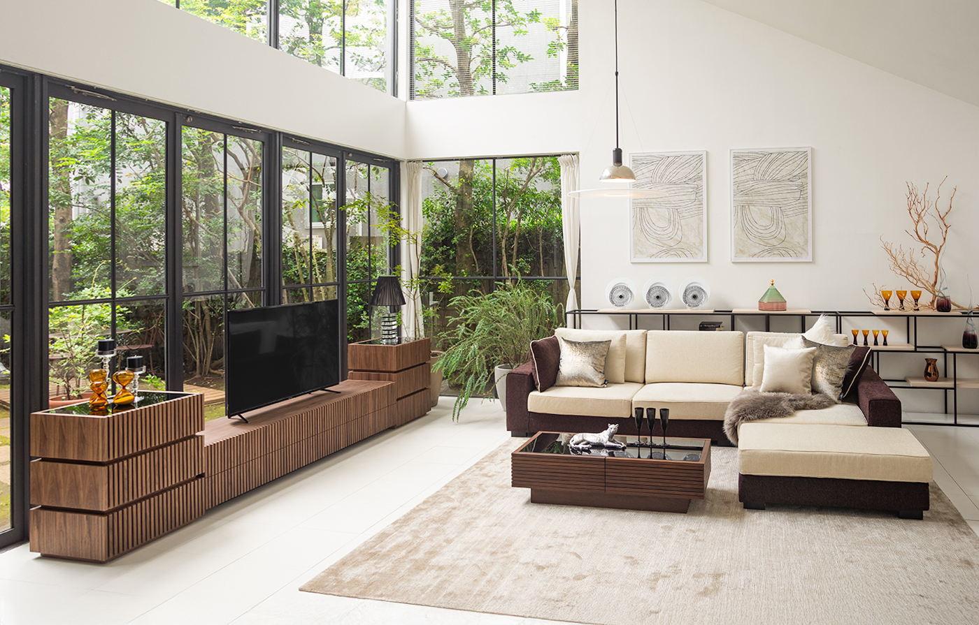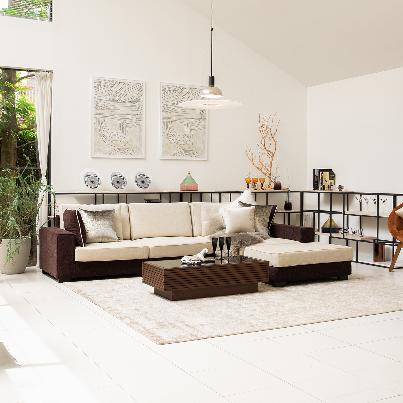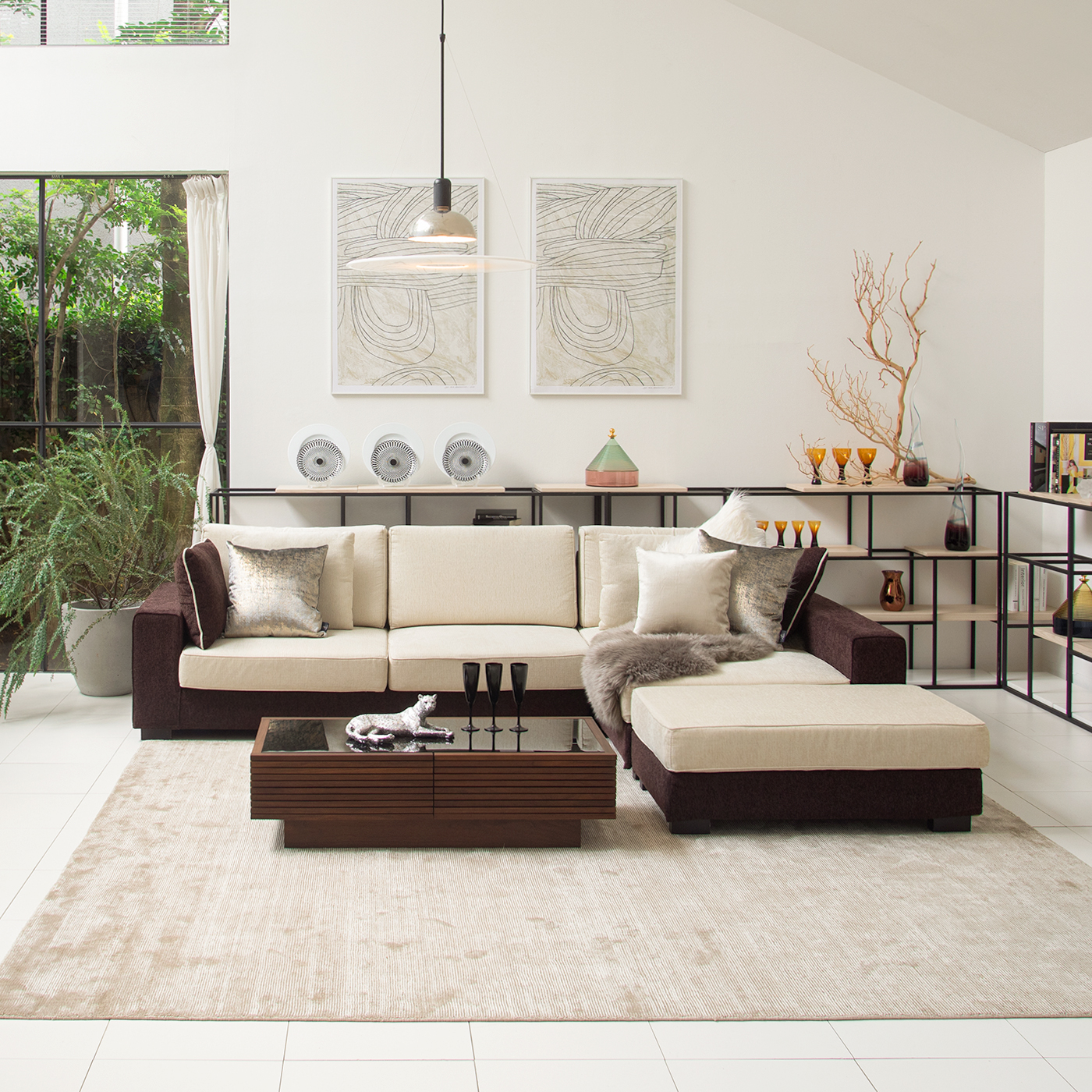 木目や木のぬくもりを織り交ぜ、丁寧な暮らしが根付く北欧モダンスタイルの主役は、チョコレート色とベージュのツートン仕様でメリハリを効かせたグランドカウチ。クッションでアクセントをつけることで華やかさがプラスし、温かみある空気と洗練された現代風スタイルに。ファーやシルク、ゴールドの箔貼り、ブークレなどクッション素材を、季節で変化をつけてコーディネートを楽しみましょう。