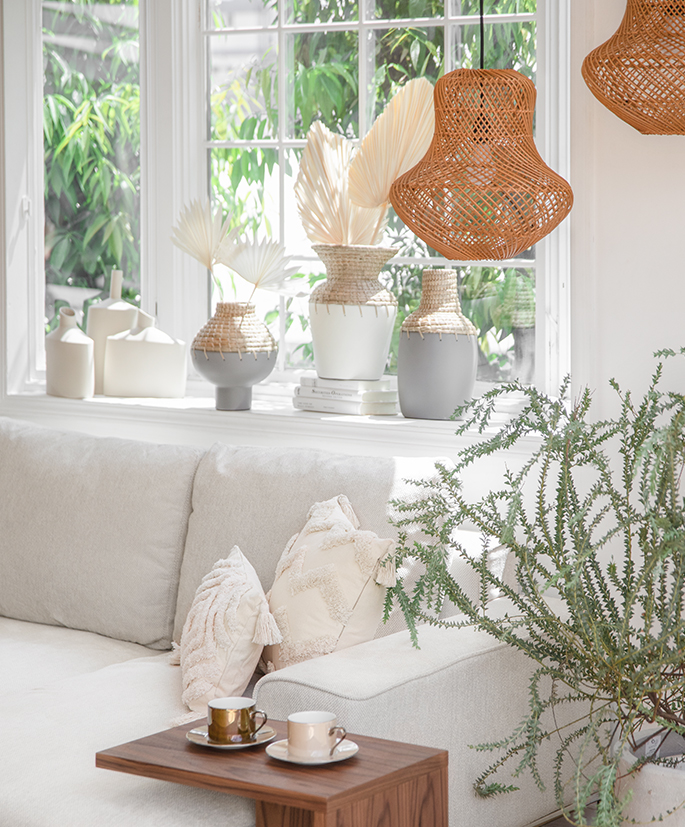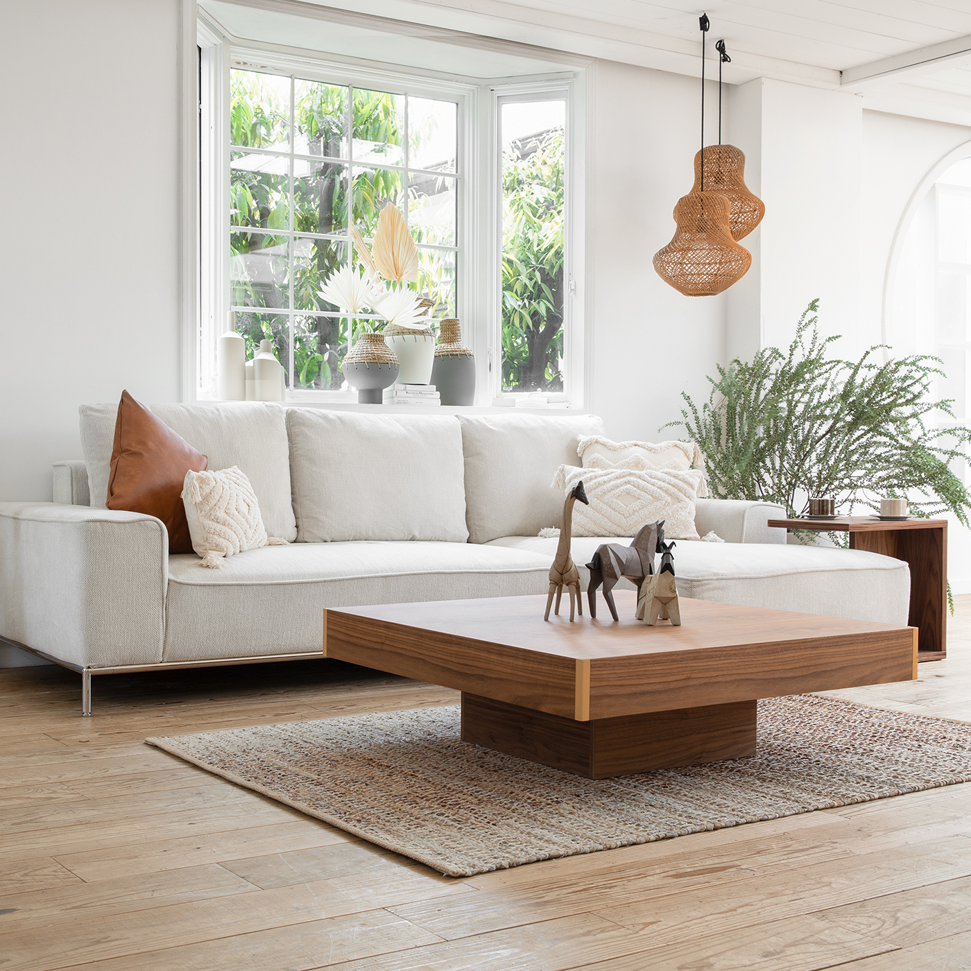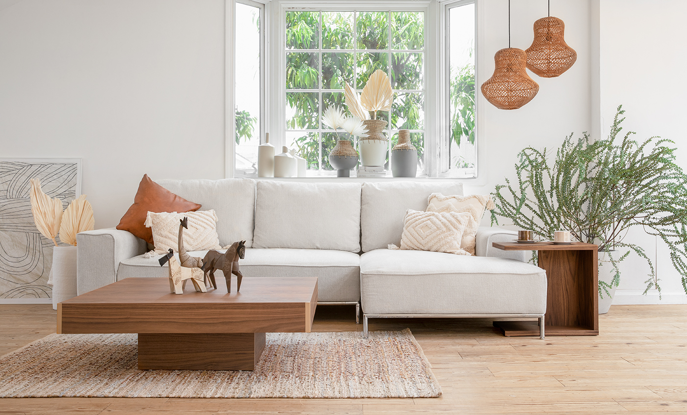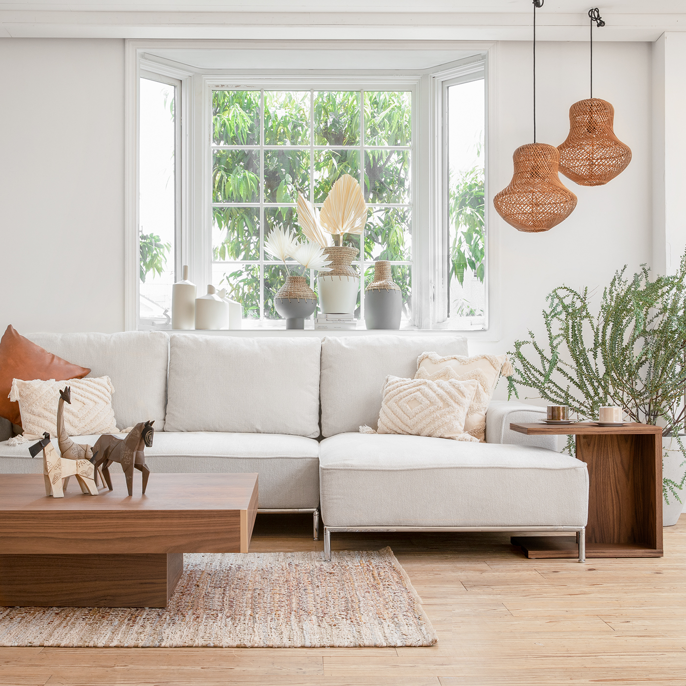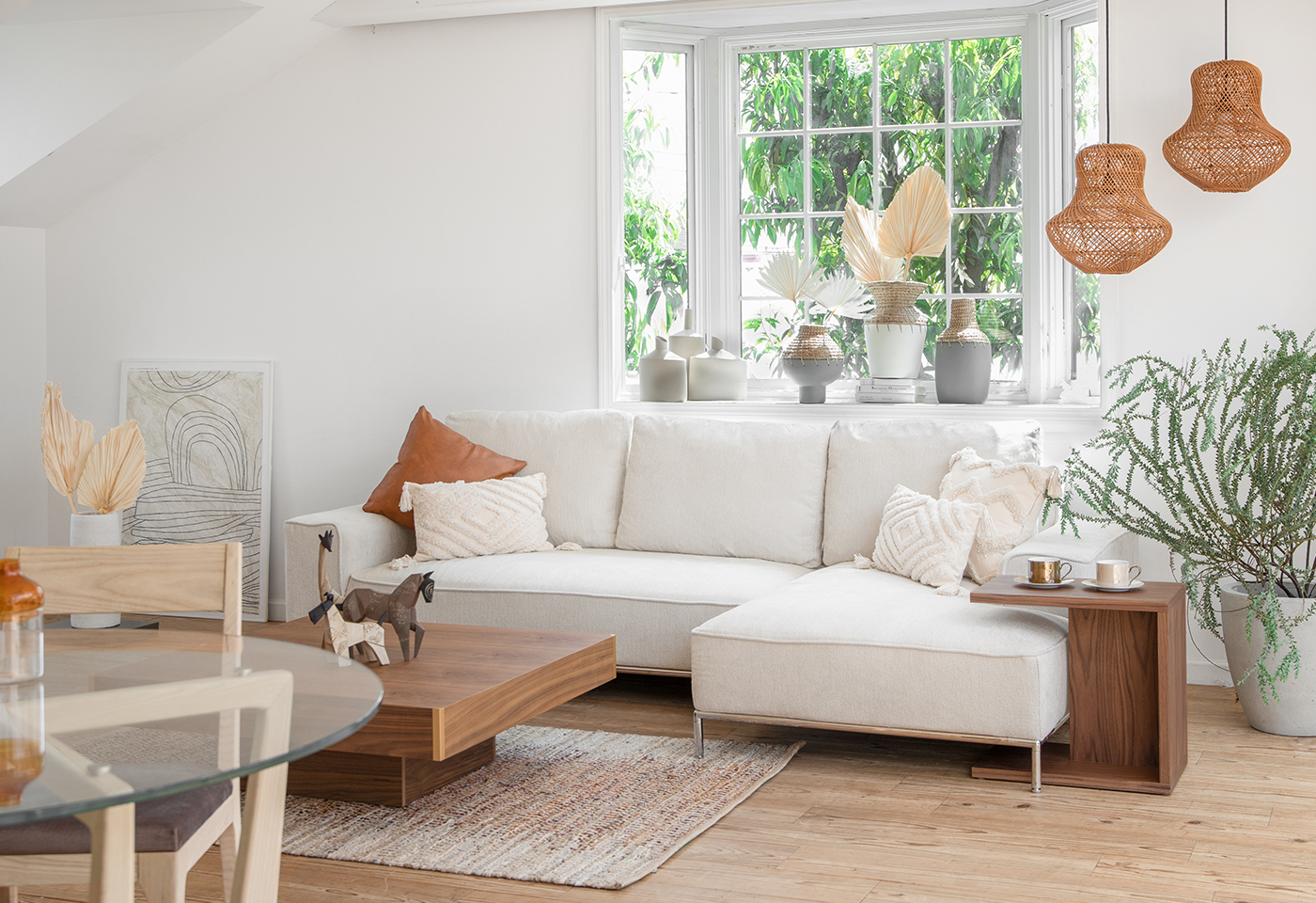 白を基調とした上品で重厚感のあるソファの魅力は、カラーテーマやシーンによって、広がるバリエーションにあります。エスニックなムードを楽しみたいなら、アースカラーのクッションやラグをプラスすることで、自然と調和する色彩が空間を広げ、心地よい解放感をもたらします。また、オフホワイトからチョコレートブラウンへのグラデーションを取り入れるのも効果的。ダークトーンの家具からライトなウッド素材との相性が良く、落ち着きとくつろぎを両立したリビングスペースが完成します。