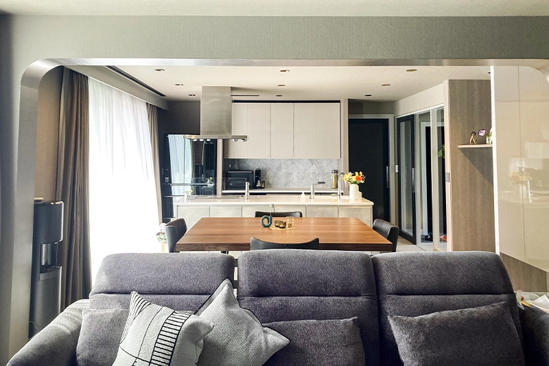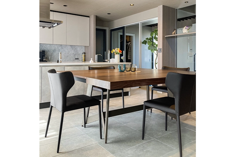 ダイニングチェアは、座面のクッションがとても柔らかく、長時間座っていても疲れません。ホテルライクなインテリアにしたかったので、アルモニアの商品を取り入れて、理想に近づけました。