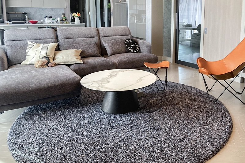 ラグは、円形にしてポイントになって良かったと思ってます。直接座っても痛くなく、毛足も長すぎず、短すぎず色も気にいっています。