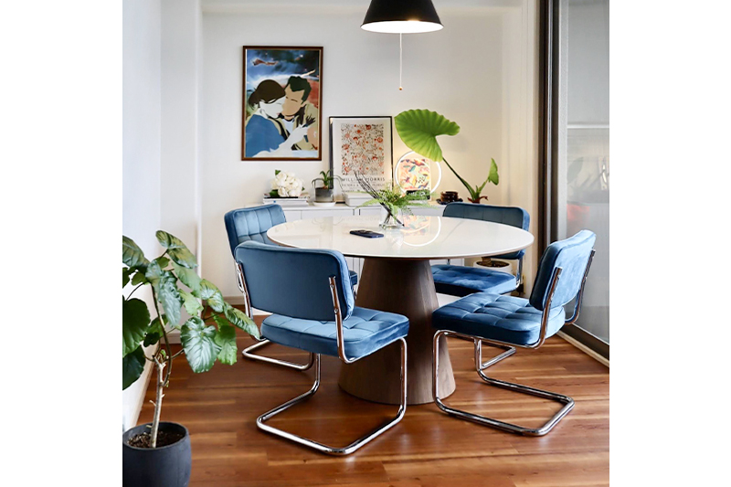 脚の部分が他にはないデザインで、角がない見た目はダイニングに暖かみをもたせてくれて、家庭を明るくして くれているような気がします笑