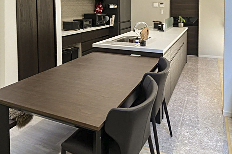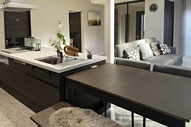 ダイニングテーブルは来客があり人数が増えた時に簡単に広げれるのがとても便利です。
