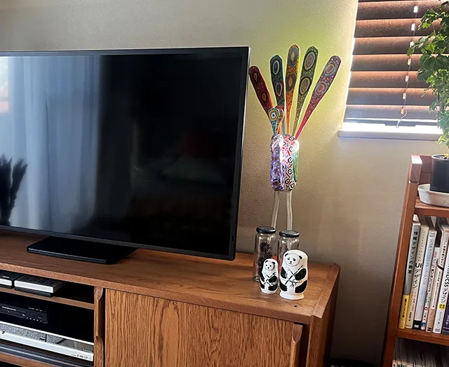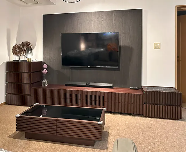 木目の存在感を活かした優美なルーバーデザインのテレビボード。時代に流されない端正な佇まいが長く愛される一台です。