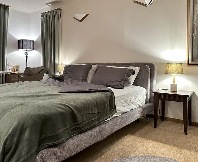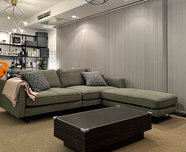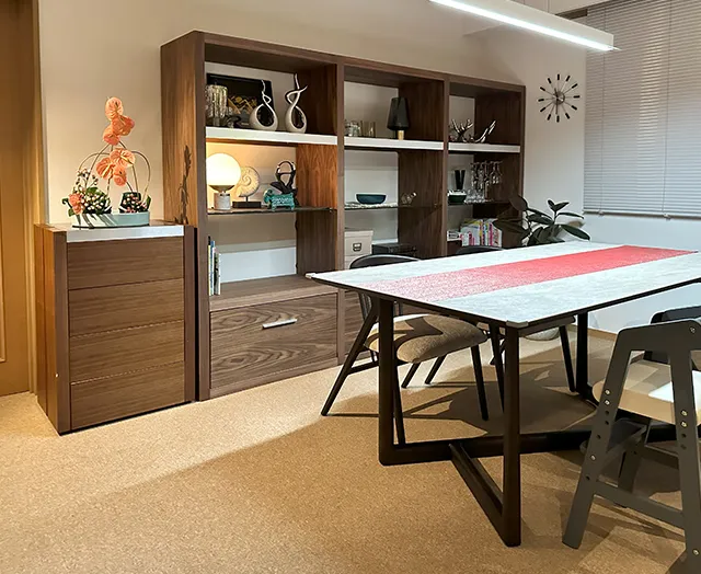 友達のように仲の良い夫婦が住むあたたかみのある一室に、木目の存在感を活かしたルーバーデザインの同種のチェストやテレビボード・テーブルが採用され、統一感のある落ち着いた空間を演出。その他、シェルフやベッドフレームなども多数採用されています。
