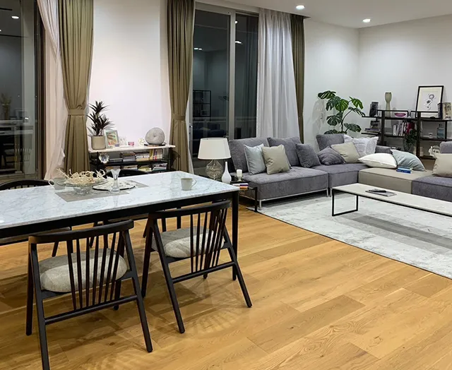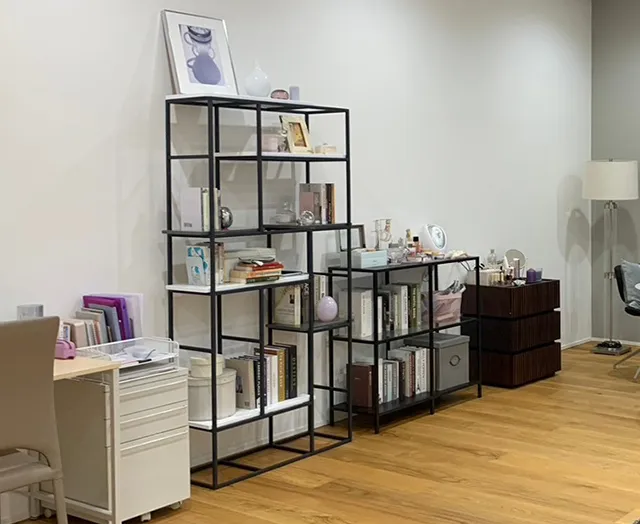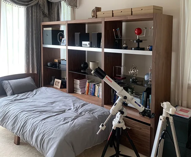落ち着いたカラーでまとまった上品な室内に、木目のあたたかみが感じられるシェルフやデスクなどを合わせることで、シックモダンな空間を演出。その他、ダイニングテーブルやソファなども採用されています。