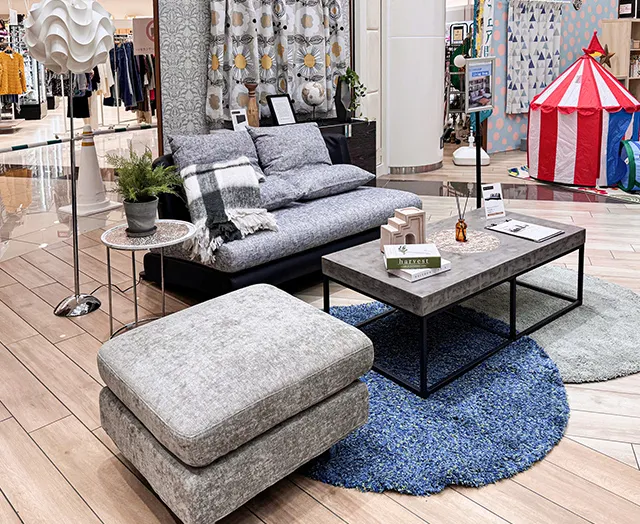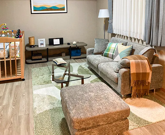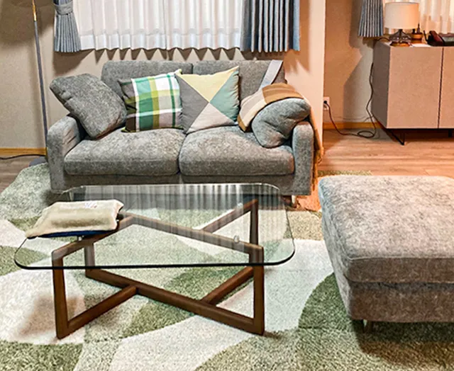 グレーのソファや天然木フレームのローテーブルがあたたかみのある自宅リビングに調和しています。