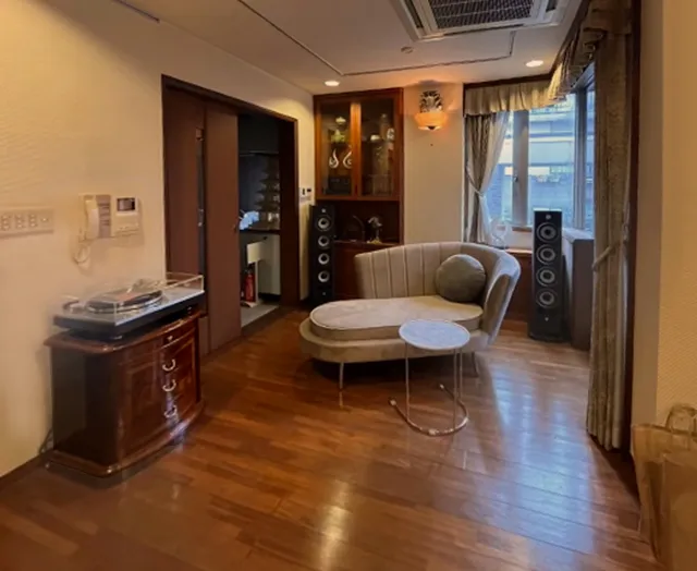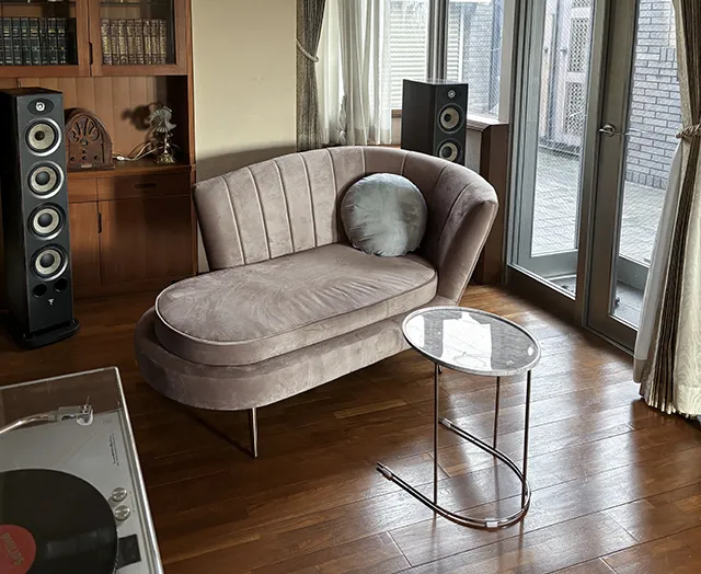 ブラウンを基調とした温かみあるお部屋の一角に、音楽がゆったりと聴けるようベロア生地の2人掛けソファや大理石のサイドテーブルを採用していただきました。