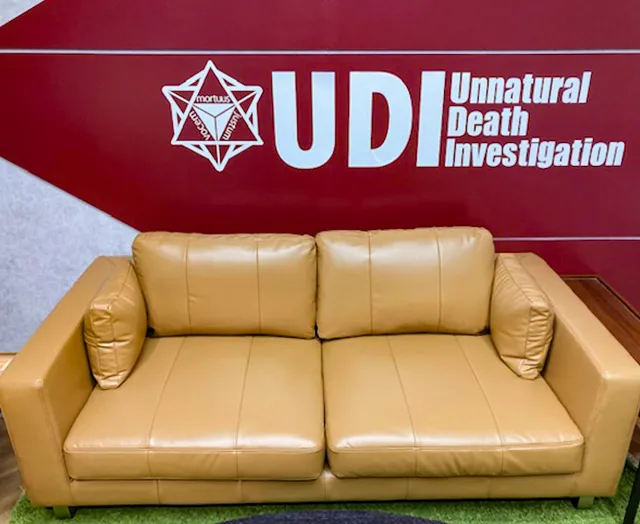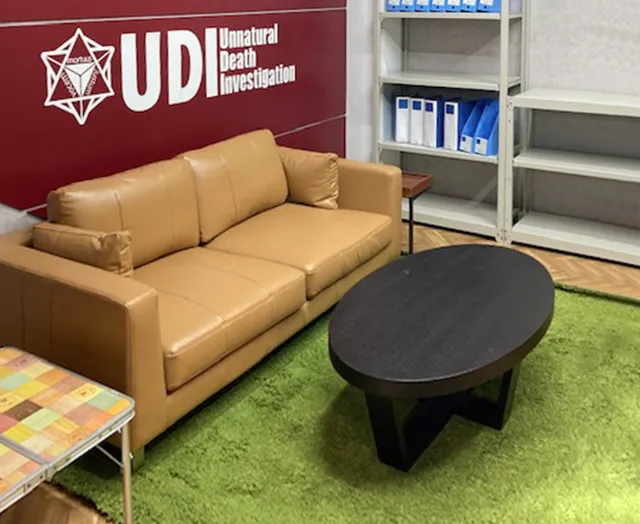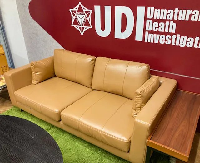 配送物の連続爆破事件の解決を奔走する姿が描かれる中で登場する「不自然死究明研究所(UDIラボ)」で、ARMONIAのレザーソファが採用されています。