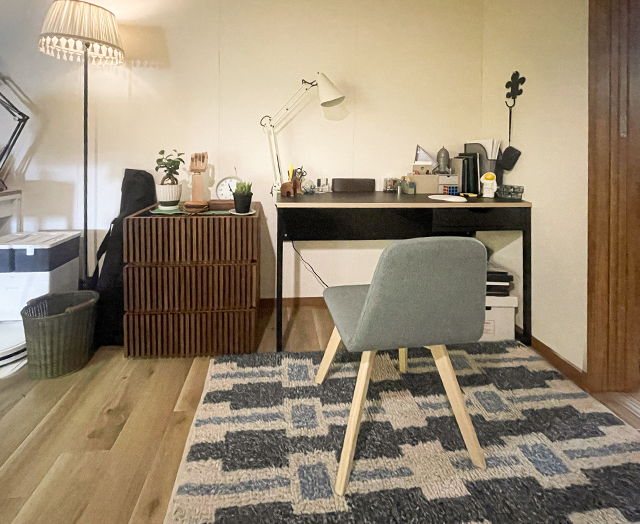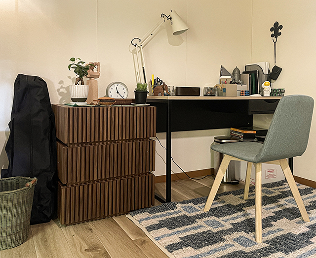 ブラックのデスクがアクセントになった、こだわりを感じさせる書斎に木目調のチェストが調和しています。積み重ねて3段にすることで大容量の収納に、また、ちょっとした小物が置けるサイドチェストとしてもお使いいただけます。