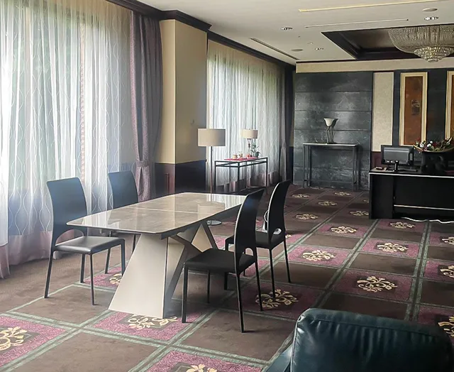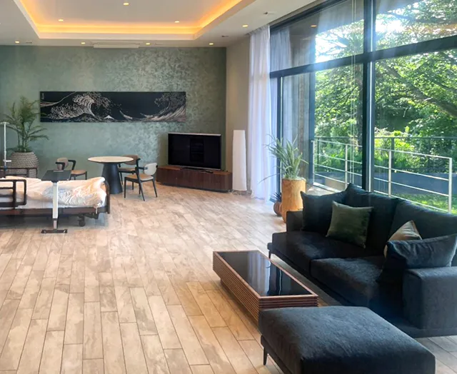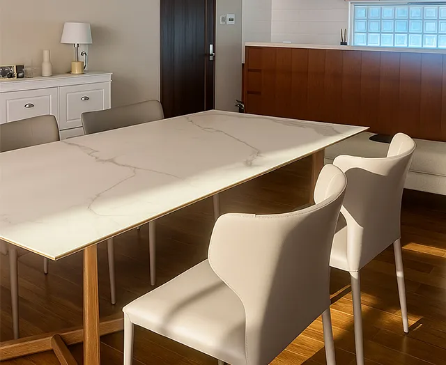 大理石調天板がラグジュアリーな伸縮式ダイニングや木目調テレビボードが、重厚感のある世界観を際立たせます。