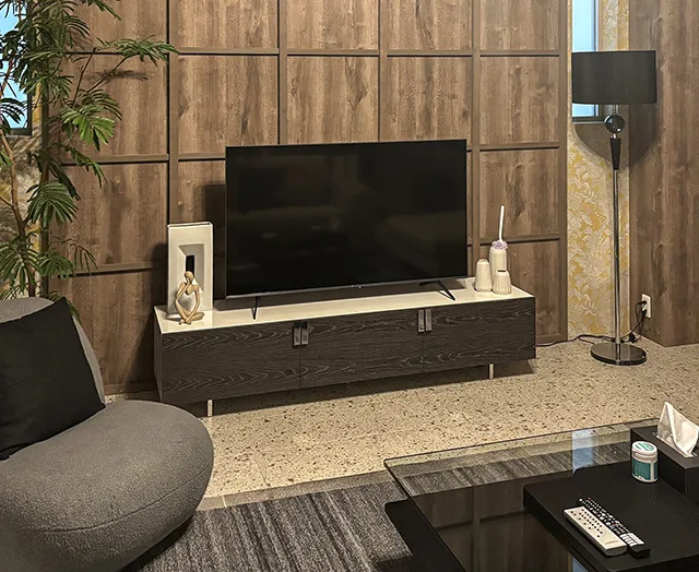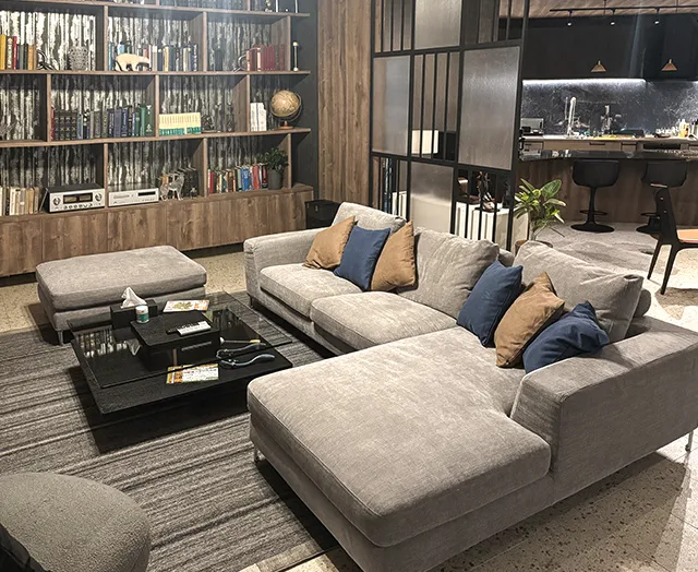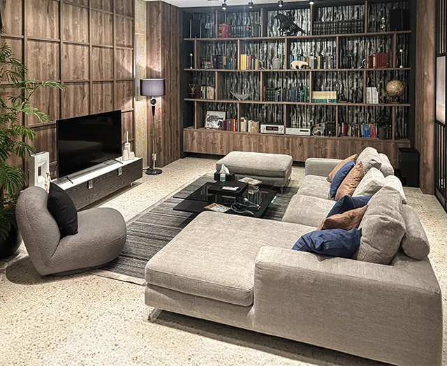 木目調のダークブラウンの家具や贅沢なまでに広々としたカウチソファがシックで重厚感のあるリビングを演出しています。