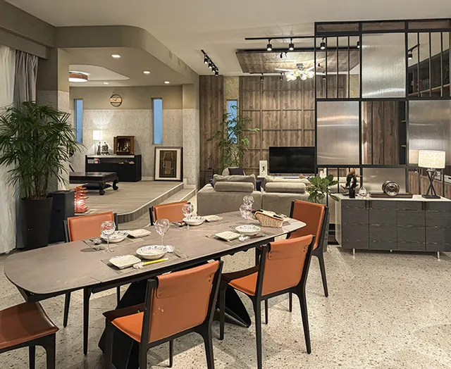 アーバンなデザイン性と上品で高級感溢れる大理石調のダイニングテーブル。伸縮可能な天板で機能性も兼ね備えた逸品です。
