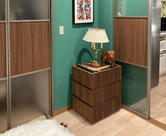 美術スタッフがこだわり細部まで作り込まれた、緻密かつ美しいセットの中に、木目調のダイニングテーブルやルーバーデザインが印象的なチェスト、上品な光沢が美しいソファなど、アルモニアのインテリアが高級感ただよう空間を演出しています。
