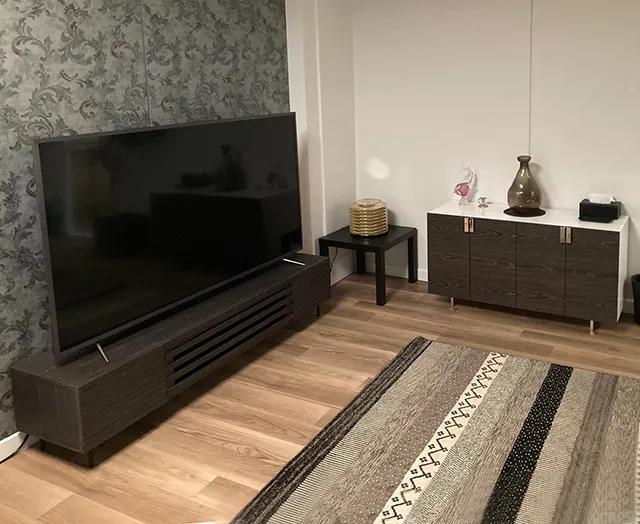 モダンラグジュアリーなお部屋には、同種の一人掛け・二人掛けソファを複数合わせた高級感あふれるリビングにコーディネートされ、華やかで落ち着いた雰囲気を演出しています。その他、テレビ台やチェストなども多数採用されています。